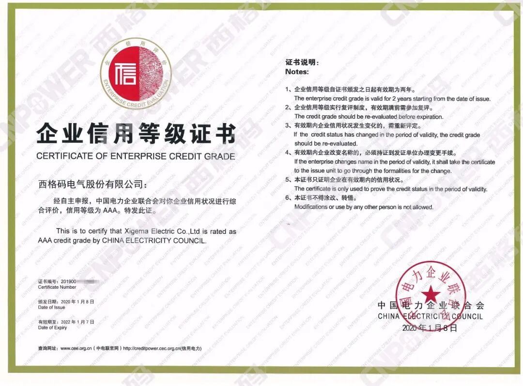 近日,從中電聯(lián)電力信用平臺(tái)傳來令人興奮的消息,西格碼電氣股份有限公司一舉獲得中電聯(lián)涉電力領(lǐng)域2019年信用企業(yè)信用3A等級(jí)評(píng)定。